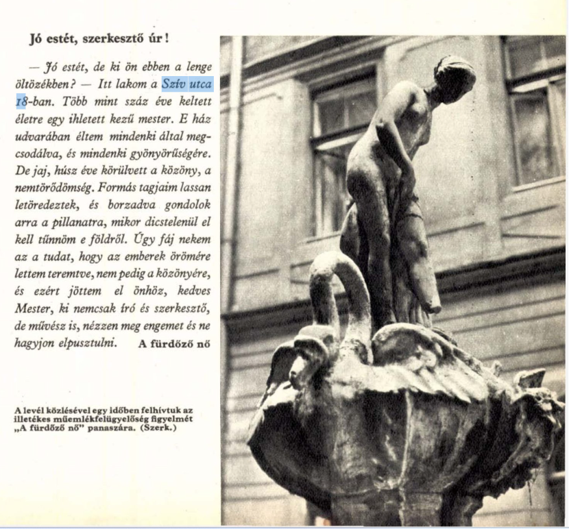 “Good evening, dear editor! – Good evening, but who are you in this revealing attire? – I reside here at 18 Szív utca. Over a century ago, a skilled master breathed life into me. I dwelled in the courtyard of this house, admired by all, and a source of delight for everyone. But oh, twenty years ago, indifference and neglect enveloped me. My exquisite features gradually deteriorated, and I shudder at the prospect of the day when I must vanish from this world. It pains me to realize that I was created for people’s enjoyment, not their indifference. That’s why I’ve come to you, dear editor, who is not only a writer but also an artist. Please cast your eyes upon me and prevent my demise. Signed: The Bathing Woman.”